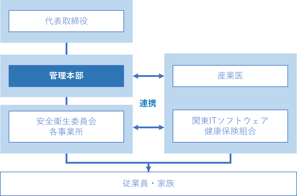 ・代表取締役を責任者とし、管理本部を中心に、産業医、関東ITソフトウェア健康保険組合との連携・支援を得ながら健康経営を推進しています。